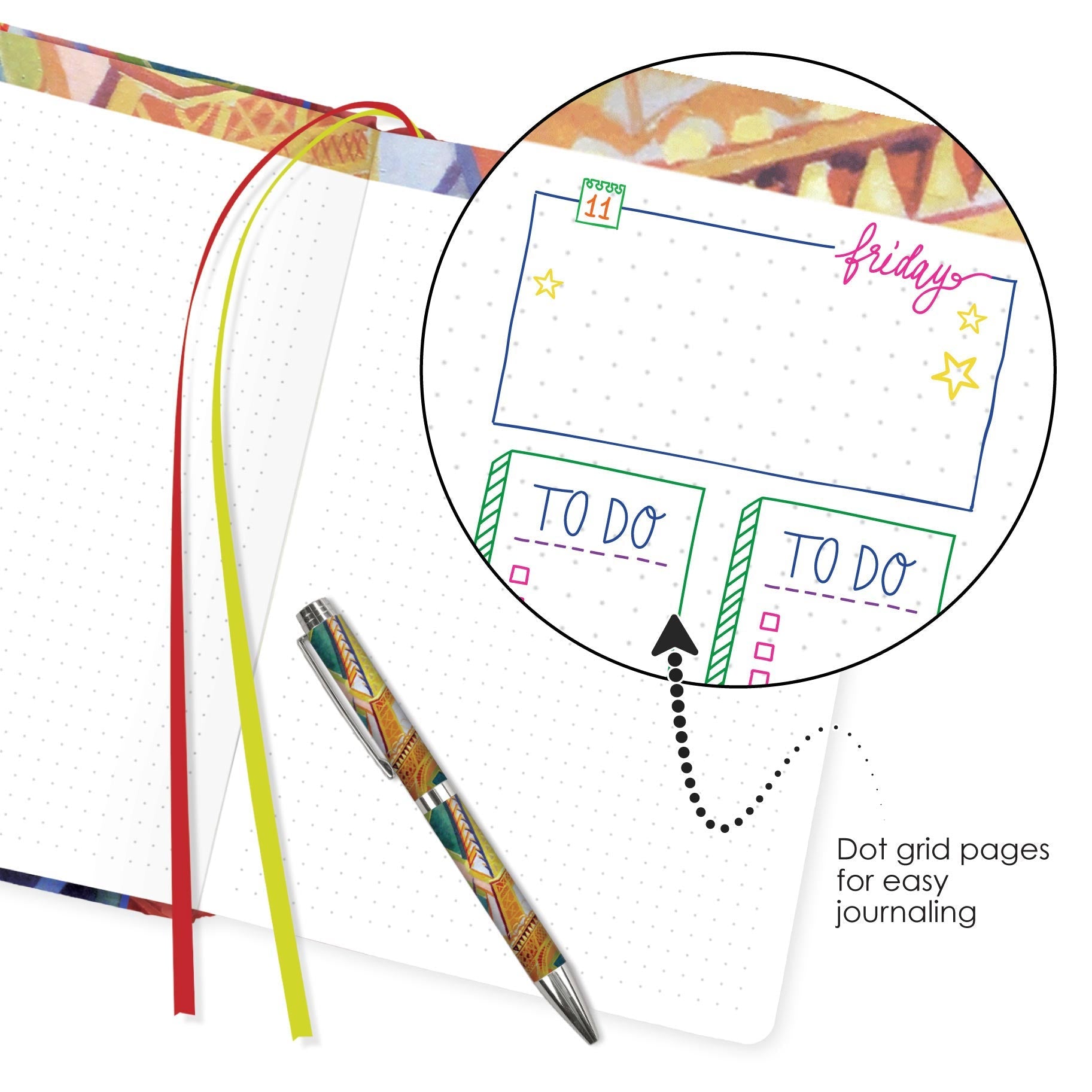 Each vegan leather journal is printed with a fine art masterpiece in vivid colors, with the artist's signature on the spine. Complete with an elastic band to keep it securely closed in your bag, two silky ribbon bookmarks to keep your place, a loop to hold your pen, and an interior pocket for ticket stubs and photographs, this journal is ready to travel wherever you might take it. Each page is micro-perforated for easy tear-out, and thick enough to prevent ink from bleeding through to the other side. With 160 dot grid pages, this luxurious journal makes a perfect gift for students, writers, travelers, and art-lovers of any kind.