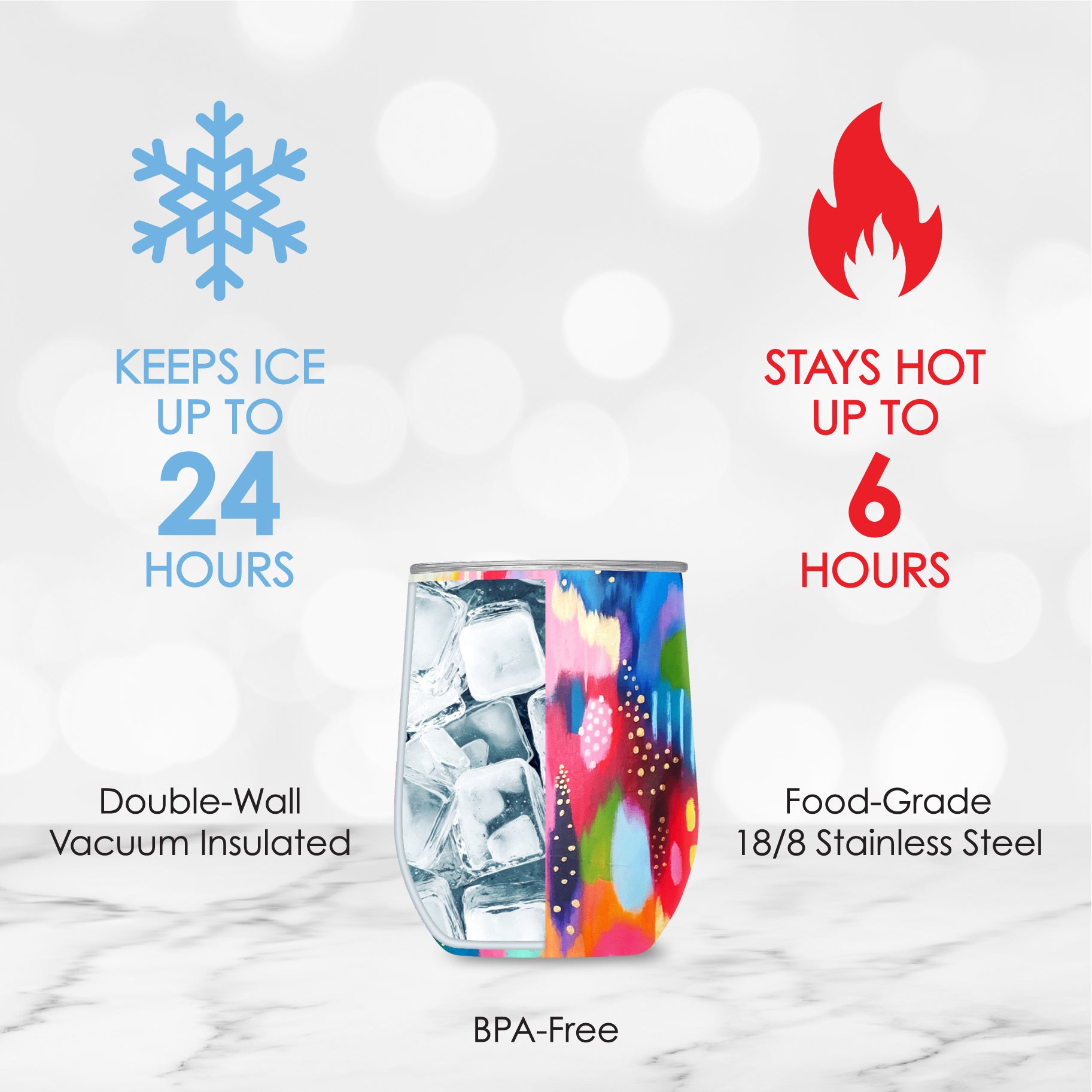 • BPA-free 18/8 stainless steel, double-wall vacuum insulated to keep hot beverages hot up to 6 hours; cold drinks up to 12 hours, keeps ice frozen for up to 1 day