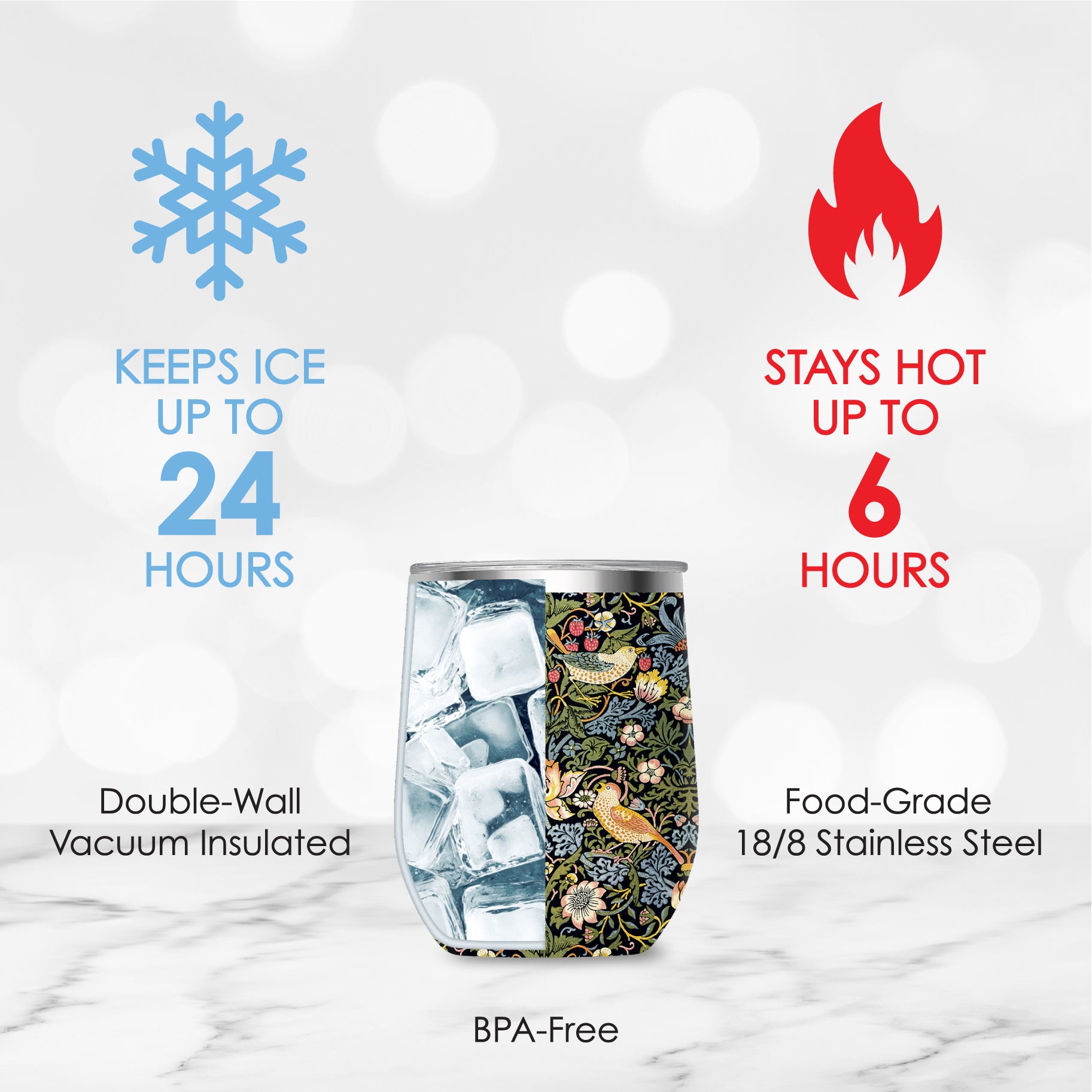 Stay Refreshed On-The-Go with Our 12oz Stainless Wine Tumbler!Discover the perfect blend of style and practicality with our Stainless Steel Wine Tumbler. The sleek, modern design of this Tumbler makes it a fashionable accessory for any occasion. Whether you're hitting the gym, the office, school, or the trails, it's the perfect choice. This double-wall vacuum insulated Tumbler keeps beverages hot for 6 hours and cold for 12, keeps ice frozen for up to 1 day ensuring you're always refreshed. Crafted from durable, BPA-free 18/8 stainless steel, it's a sustainable and eco-friendly choice. The leak-proof design guarantees a mess-free experience, while the wide mouth simplifies cleaning. Elevate your hydration game, reduce waste, and enjoy hassle-free adventures with this travel-friendly companion.Our product features exquisite designs inspired by the timeless artistry of William Morris. Known for his intricate patterns and attention to detail, Morris's work brings a touch of classic elegance and sophistication to our design, making each piece a beautiful blend of art and functionality. Enjoy the rich heritage and artistic flair of William Morris in every aspect of our product.Stunning rendering of William Morris famous art, "Strawberry Thief." The design is captured with an artist's eye for detail, light & color.