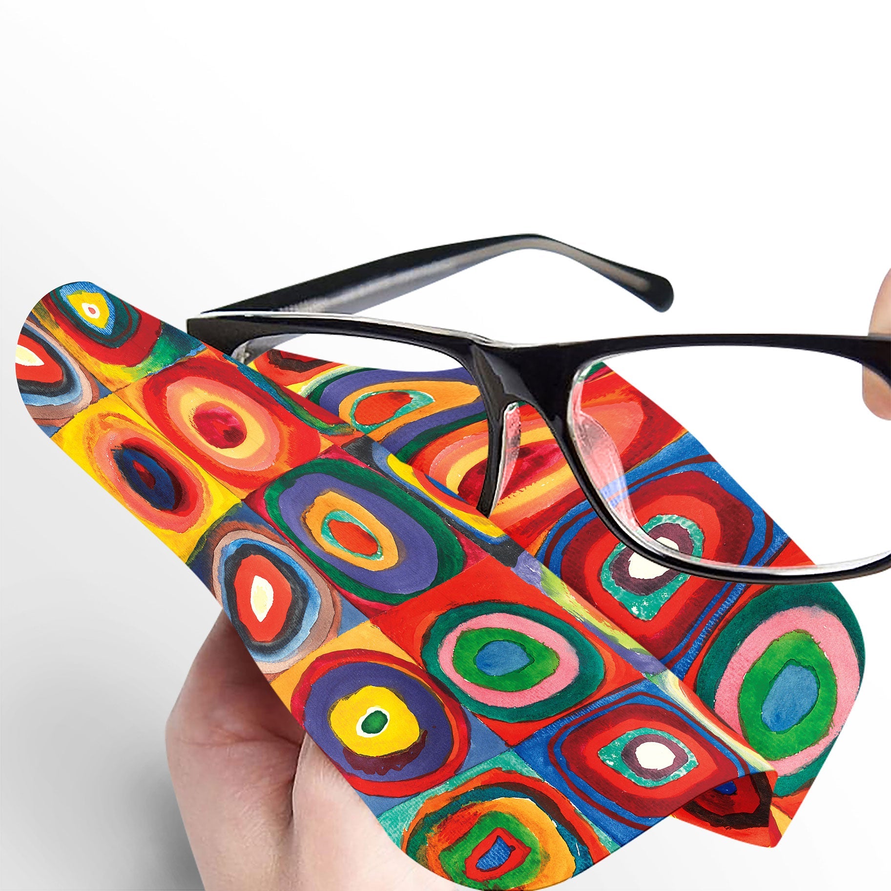 Introducing our High-Quality Microfiber Lens Cleaning Cloth - 6"x6" with Beautiful Fine Art Prints, featuring Kandinsky Circles. This microfiber cleaning cloth is a versatile and perfect accessory for cleaning eyeglasses, sunglasses, phones, screens, and blue-light glasses.
