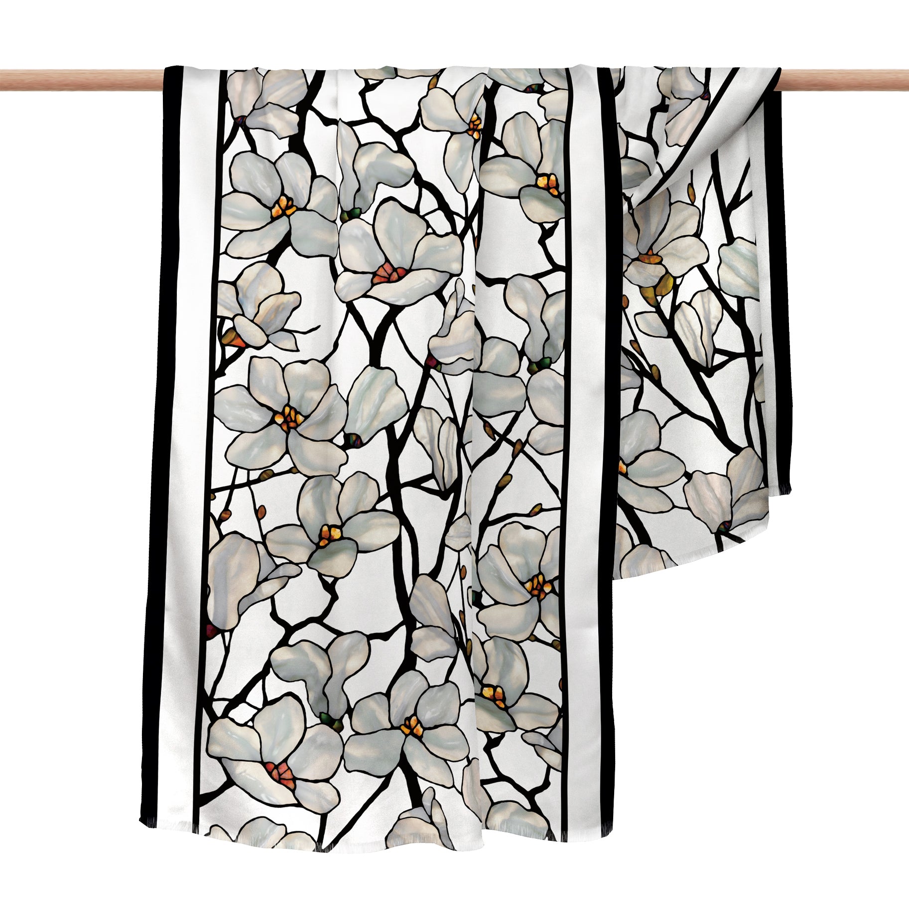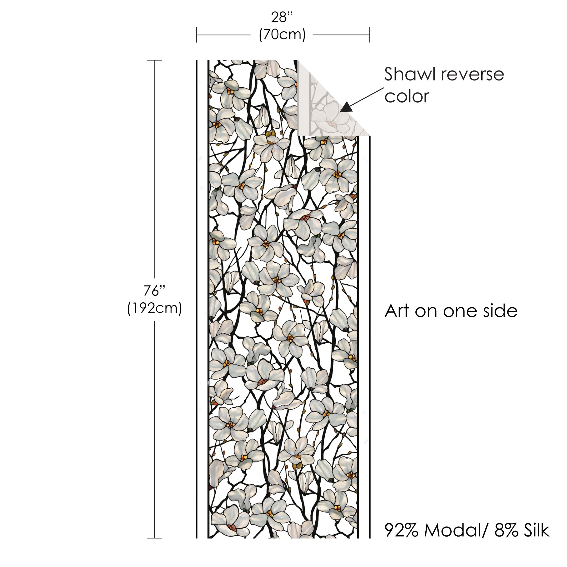 Artfully chic RainCaper Fine Art Shawls are functional, fashionable and fabulous! Wrap yourself in this luxurious Tiffany Magnolia shawl which can be worn in various ways. This stylish women's shawl is silky-soft and has a delicate eyelash fringe giving it a touch of elegance – a wearable work of art!