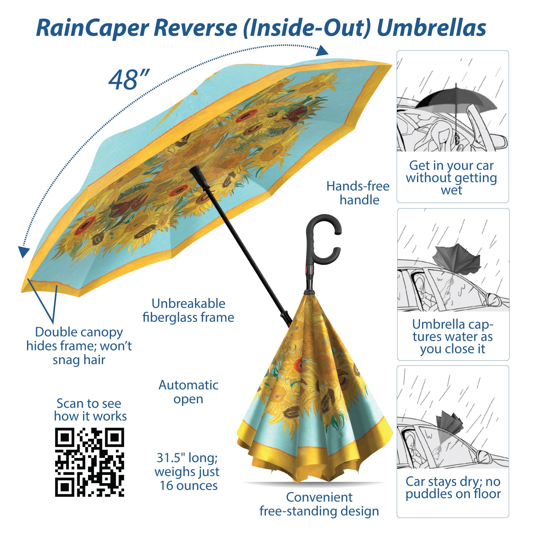 The artfully designed double canopy displays the artwork on both the top and interior of the inverted umbrella, so you'll look radiant, rain or shine. The unique construction captures rain to keep cars and floors dry, and the free-standing umbrella design eliminates the need for an umbrella stand. A must-have accessory for museum patrons; matches the van Gogh Sunflowers RainCaper travel cape.