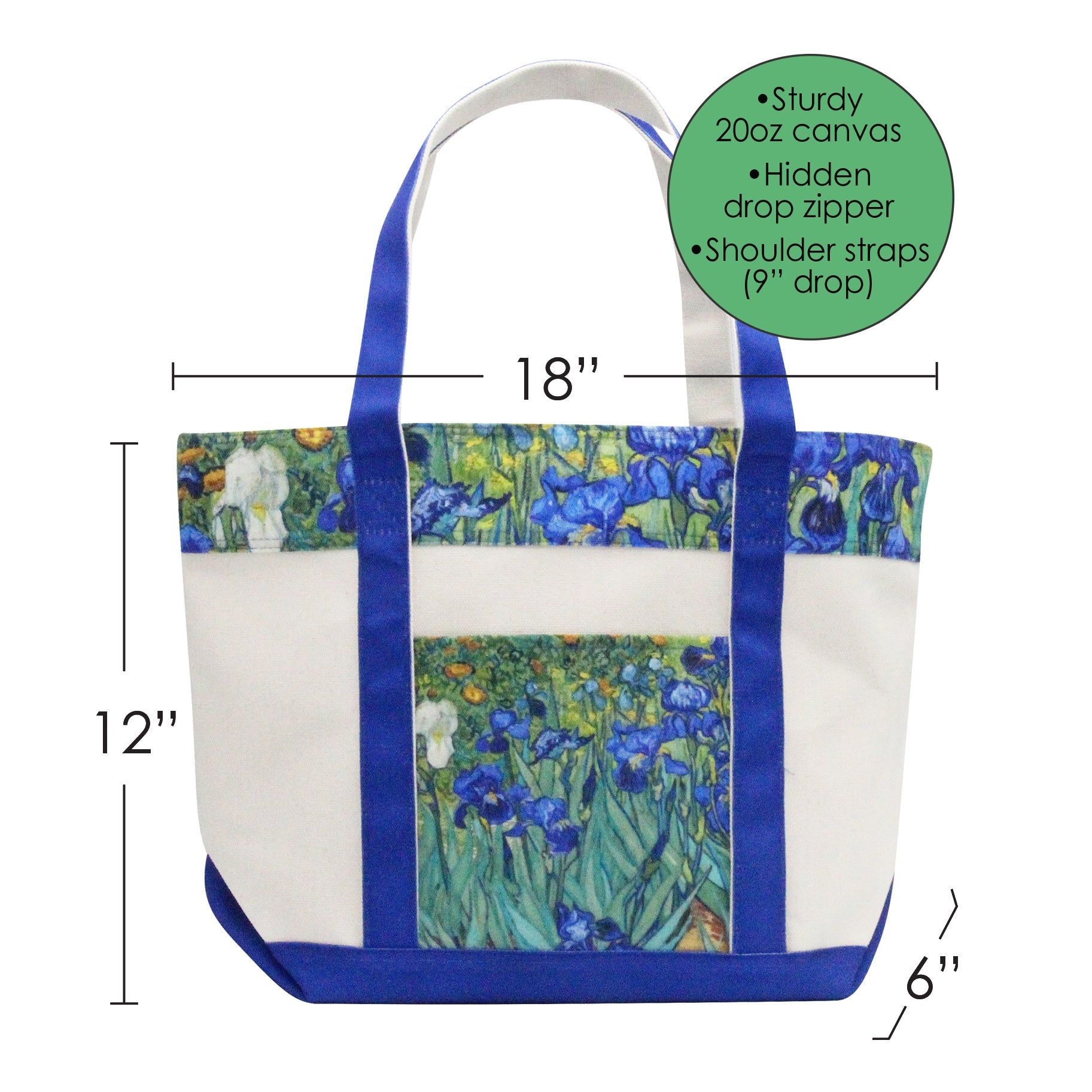 RainCaper Large Canvas Boat Tote Bag – Your Ultimate Travel and Leisure Companion! Your ideal companion for various activities featuring the beautiful art "Irises" inspired design by "Vincent van Gogh". This 18" x 12" x 6" tote is perfect for the beach, grocery shopping, travel, and more. Its top-quality 20oz canvas, reinforced stitching, and three handy pockets, including a zip top for added security, make it a durable and practical choice. Plus, the 9" drop shoulder straps ensure easy and comfortable carrying. Elevate your daily adventures with this stylish and reliable tote.
