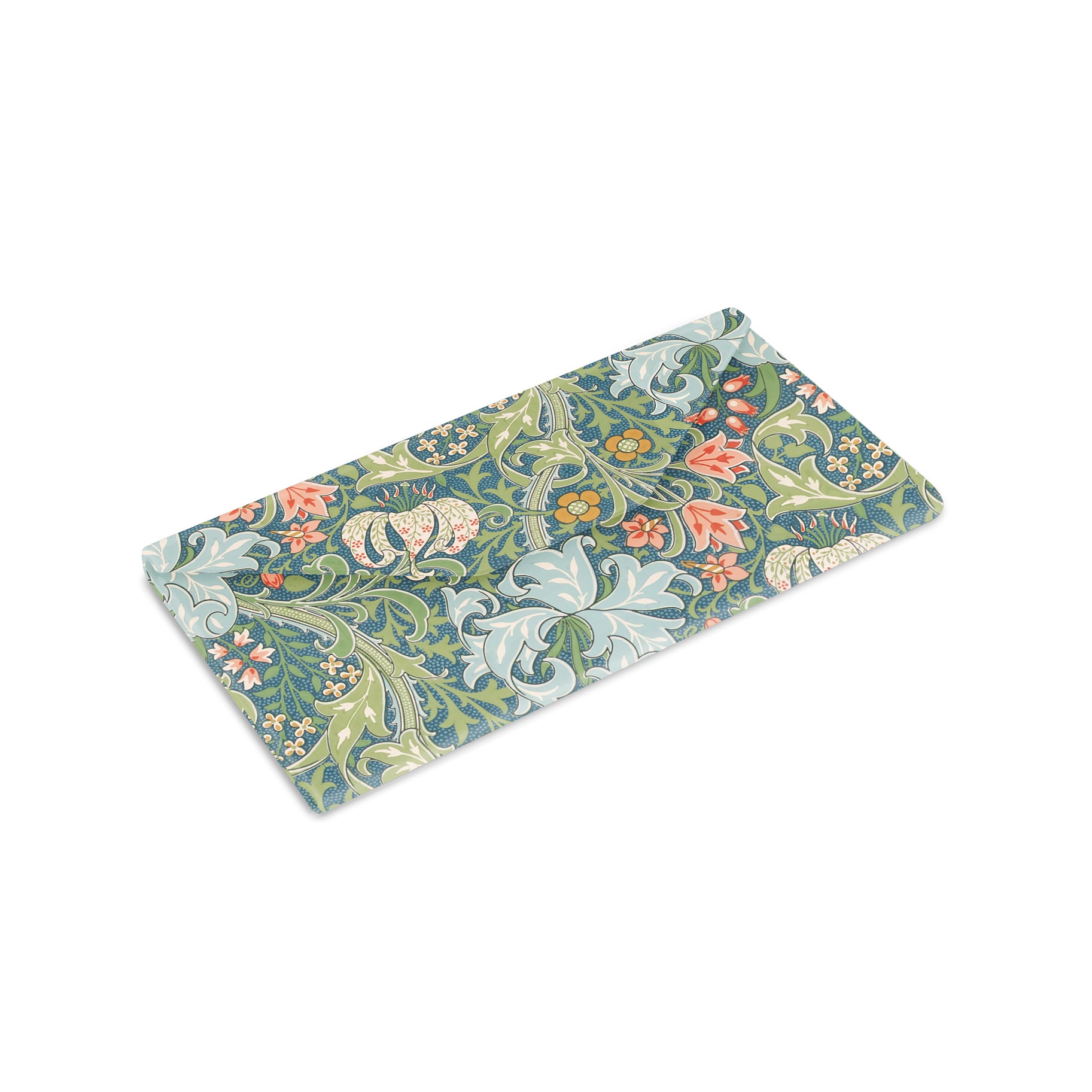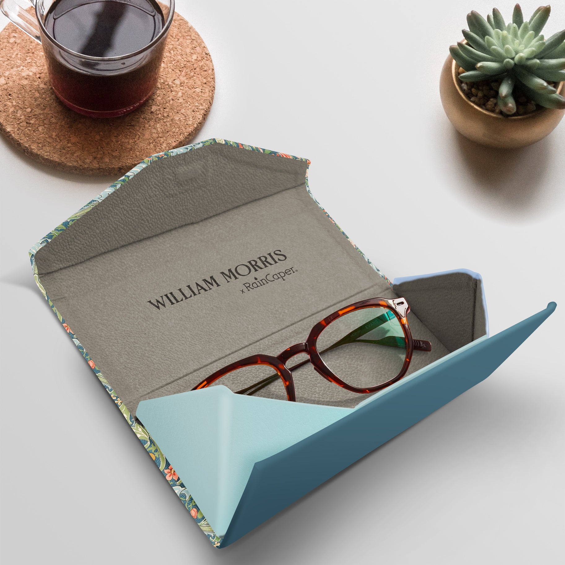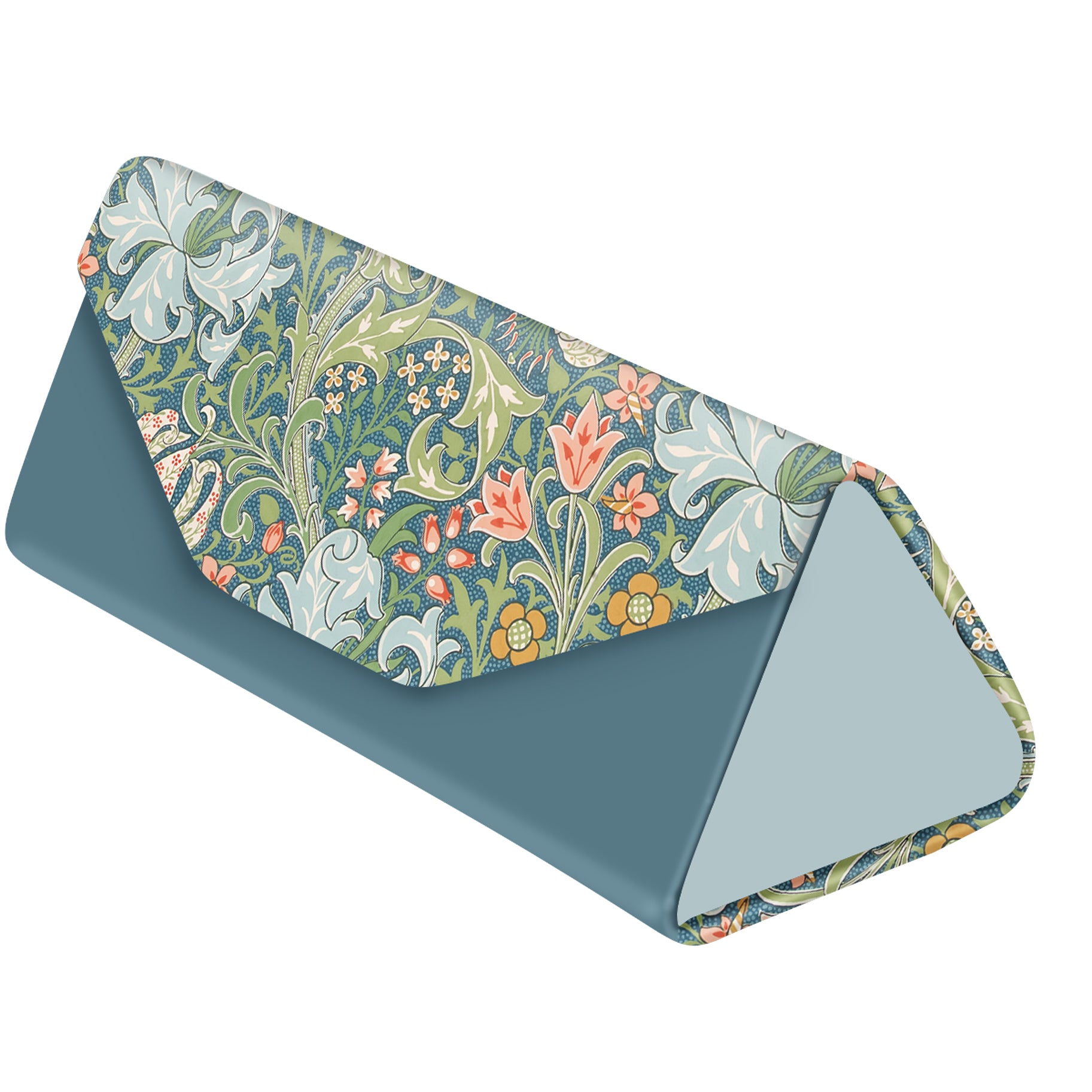 Brilliantly simple folding triangle case fits sunglasses and eyeglasses of all sizes. Matte soft touch vegan leather features a stunning overall art print. Case is sturdy, yet folds flat for compact storage. Ultra-soft lining keeps glasses from scratching.